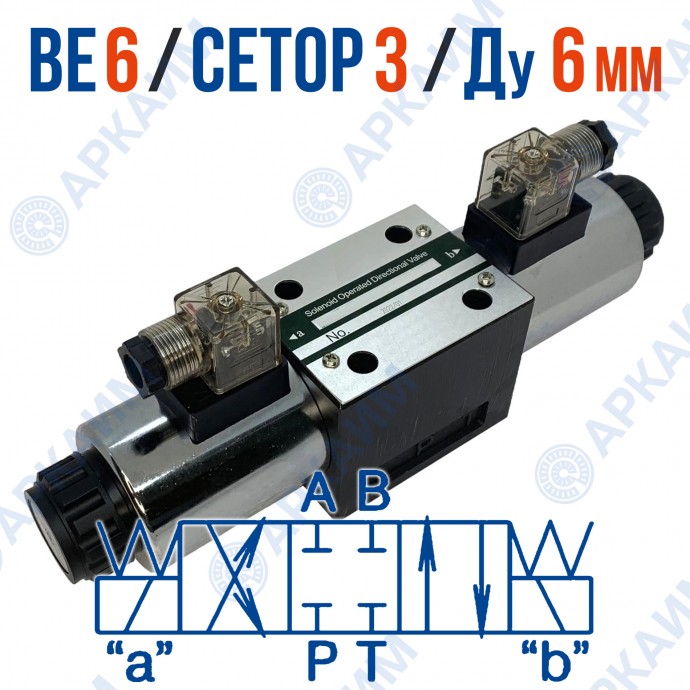 Распределитель ВЕ 6 44 Г12 – компонент гидросистемы модульного монтажа, используемый для управления потоком рабочей жидкости, путем переключения выходов подключенных питающих линий. Конструкция изделия включает надежный золотниковый механизм и управляющие электромагнитные катушки с коннекторами.