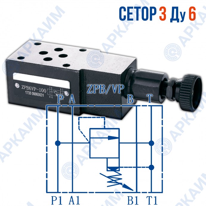 Предохранительный клапан ZPB6VP CETOP 3 / Ду 6 мм - гидравлический компонент модульного монтажа, применяемый для предохранения гидролинии от превышения давления. Настройка клапана происходит в диапазоне регулировки давлений от 0 бар до 315 бар путем вращения маховика. Монтаж модуля производится на плиту стандарта СЕТОР 3 с каналами Ду 6 мм.