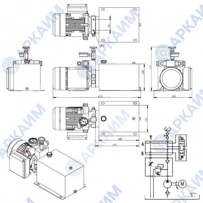 На гидростанцию установлен электродвигатель питанием 220 В, имеющий мощность в 2,2 кВт. Комплектуется стальным сварным баком на 12 л. с заливной горловиной. Производительный гидронасос, смонтированный в гидробак, обеспечивает производительность до 4,5 л/мин при давлении 160 бар. В конструкции электромагнитный распределитель ВЕ6 64 220В, подающий давление в систему через отверстия G3/8".