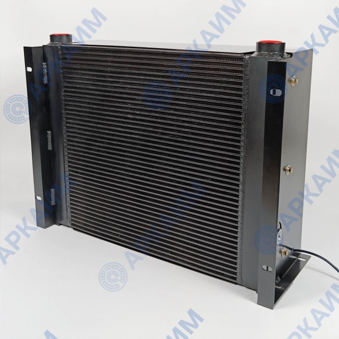 Конструкция маслоохладителя включает производительный осевой вентилятор на 380 В, закрепленный на радиаторе с помощью диффузора. Работу вентилятора регулирует термостат, вмонтированный в радиатор: реле включает обдув при достижении температуры масла 50 °С, и по мере охлаждения, отключает его.