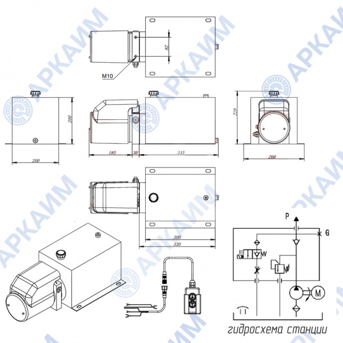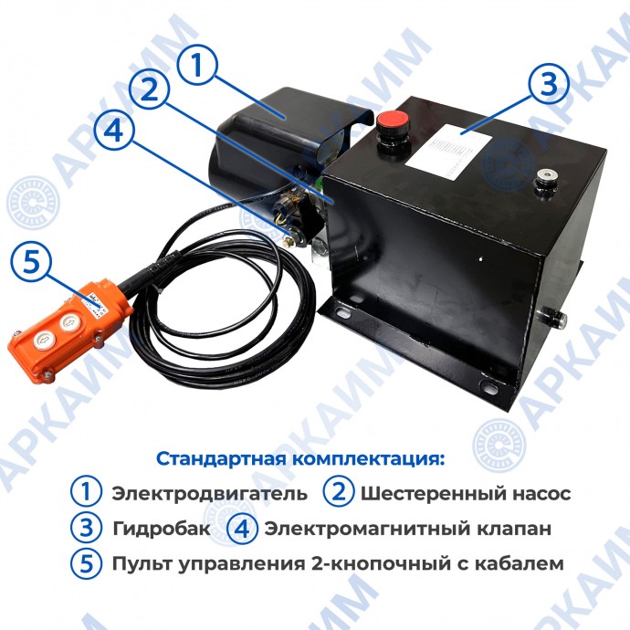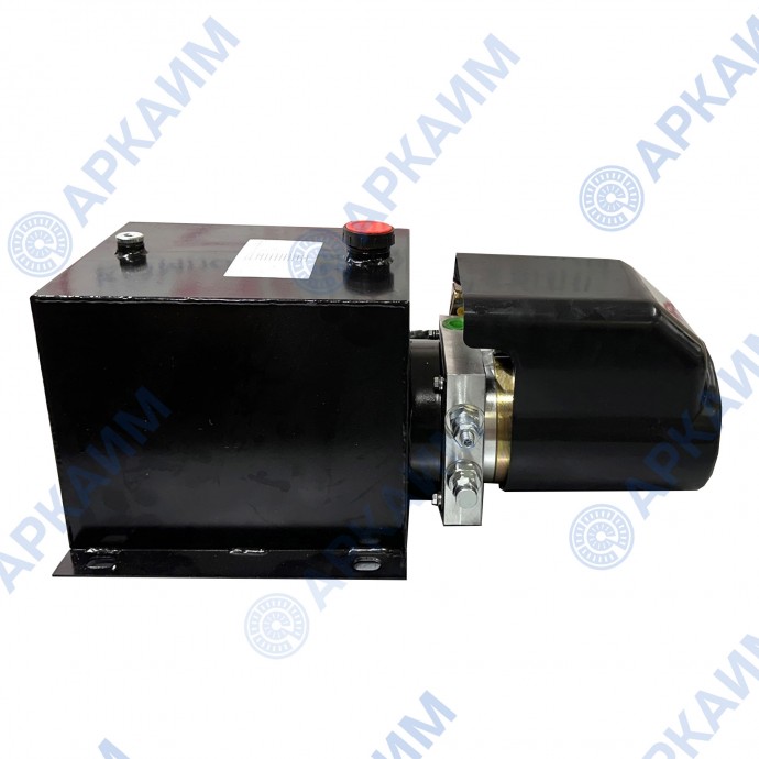 На гидростанцию установлен электродвигатель питанием 12 В, имеющий мощность в 1.6кВт. Комплектуется стальным сварным баком на 10 л. с заливной горловиной. Производительный гидронасос, смонтированный в гидробак, обеспечивает производительность до 6 л/мин при давлении 100 бар. Номинальное давление в гидросистеме 155 бар при максимальном в 200 бар. В комплекте пульт с двумя кнопками (кабель 1.8 м), который управляет электромагнитным шаровым клапаном SV-08-2NCP-M-DC12V, подающим давление в систему через отверстия G3/8".