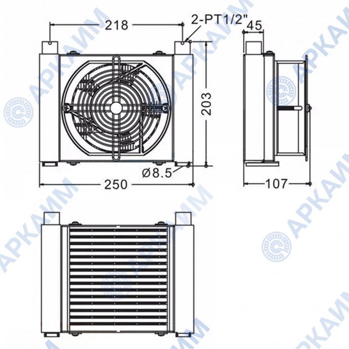 Конструкция маслоохладителя включает производительный осевой вентилятор на 380 В, закрепленный на радиаторе с помощью диффузора.