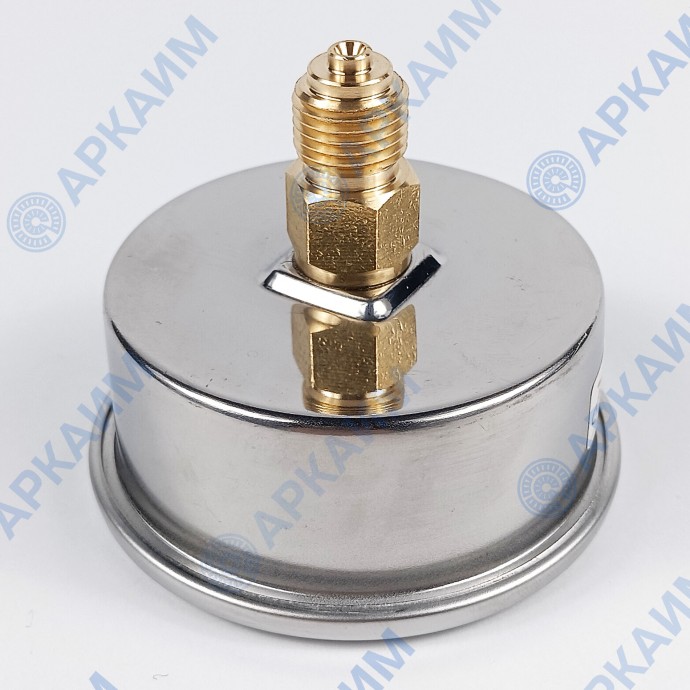 Корпус манометра YN63Z 0/6 изготовлен из стали AISI 304, циферблат и стрелка из алюминия, а штуцер медный. Рабочая температура эксплуатации изделия от -5 °С до +60 °С.