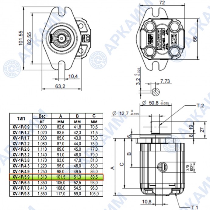 Гидронасос Vivoil X1P3161BBBA (XV-1P/5,9) 1 гр, 5,85 см3, до 29,5 л/мин, 3/8" BSPP, левое вращение
