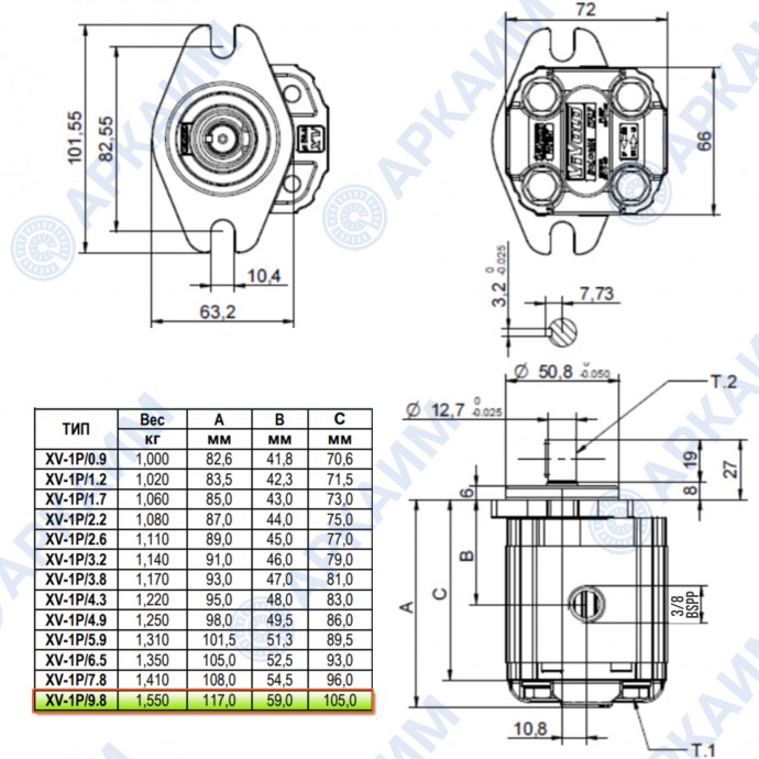 Гидронасос Vivoil X1P3662BBBA (XV-1P/9,8) 1 гр, 9,88 см3, до 39,2 л/мин, 3/8" BSPP, правое вращение
