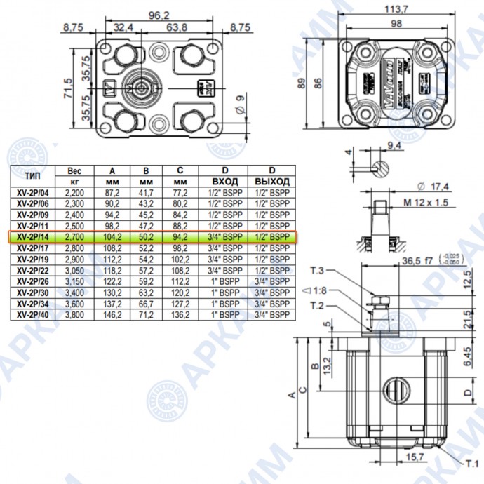 Гидронасос Vivoil X2P4902ECBA (XV-2P/14) 2 гр, 14.40 см3, до 49 л/мин, Ø17,4, правое вращение