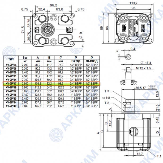 Стандартная поставка включает конический вал 1:8 ø17,4 с резьбой на конце M12x1,5 и шпонкой 4 мм, но этот насос имеет и другие модификации с цилиндрическим и фрезерованным валами (подробнее в технической спецификации).