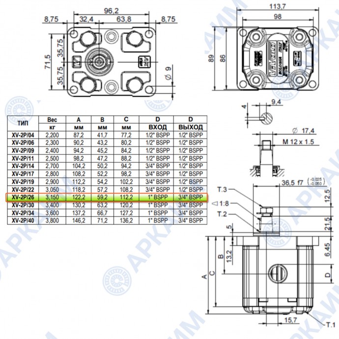 Гидронасос Vivoil X2P5701EDCA (XV-2P/26) 2 гр, 26.20 см3, до 78 л/мин, Ø17,4, левое вращение