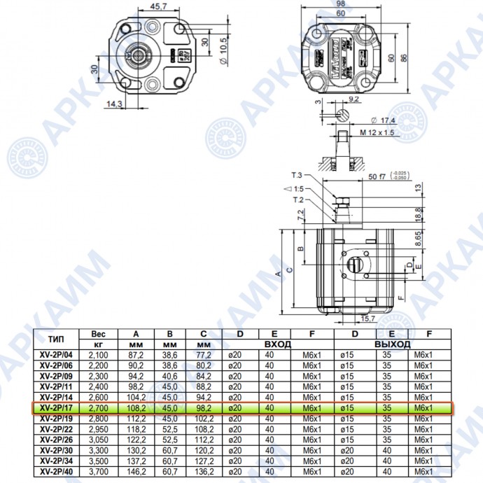 Гидронасос Vivoil X2P5122FSRA (XV-2P/17) 2 гр, 16.80 см3, до 59.5 л/мин, Ø17,4, M6, правое вращение