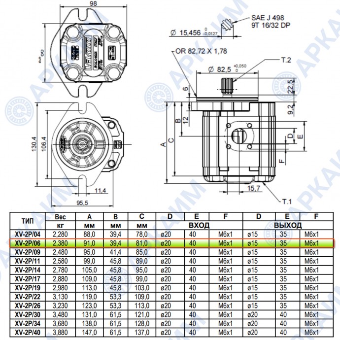 Стандартная поставка включает шлицевой вал ø15, 456 z=9 H=22.5, но этот насос имеет и другие модификации с цилиндрическим и фрезерованным валами (подробнее в технической спецификации).