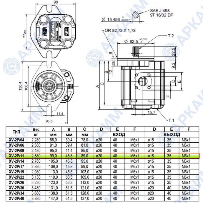 Стандартная поставка включает шлицевой вал ø15, 456 z=9 H=22.5, но этот насос имеет и другие модификации с цилиндрическим и фрезерованным валами (подробнее в технической спецификации).