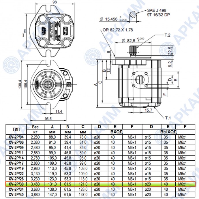 Гидронасос Vivoil X2P5952ISSA (XV-2P/30) 2 гр, 30 см3, до 75 л/мин, Ø15, M6, правое вращение