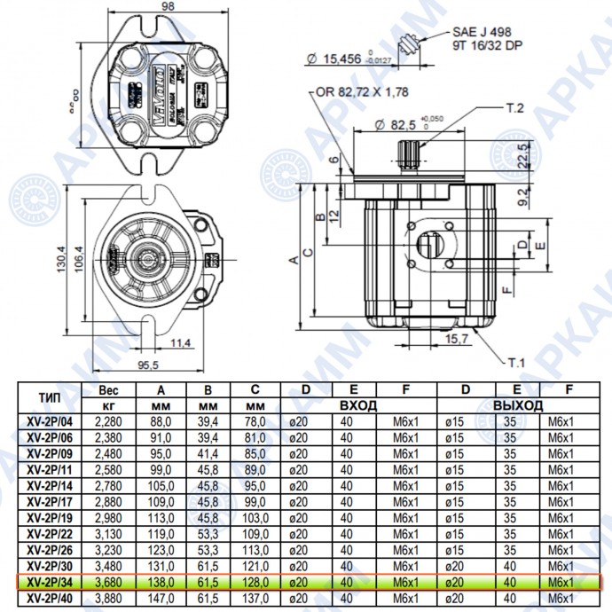 Гидронасос Vivoil X2P6152ISSA (XV-2P/34) 2 гр, 34.20 см3, до 85 л/мин, Ø15, M6, правое вращение