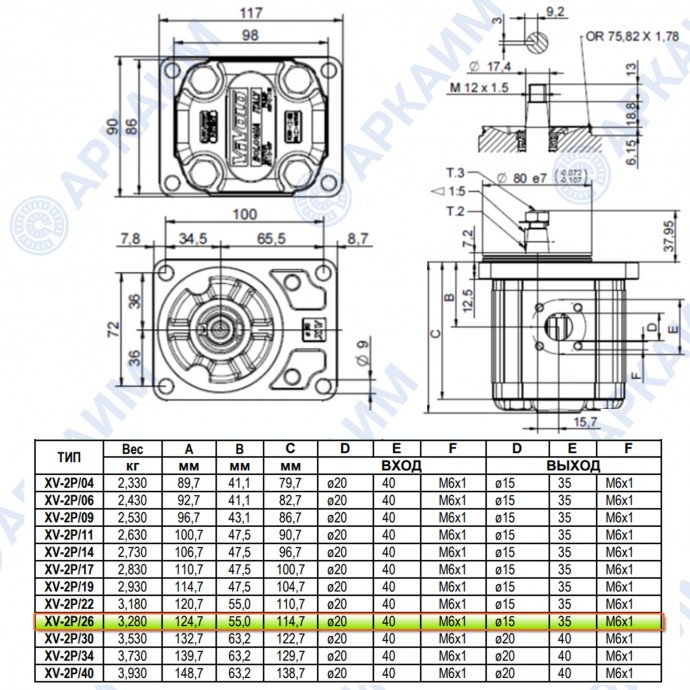 Гидронасос Vivoil X2P5741FSRA (XV-2P/26) 2 гр, 26.20 см3, до 78 л/мин, Ø17,4, M6, левое вращение