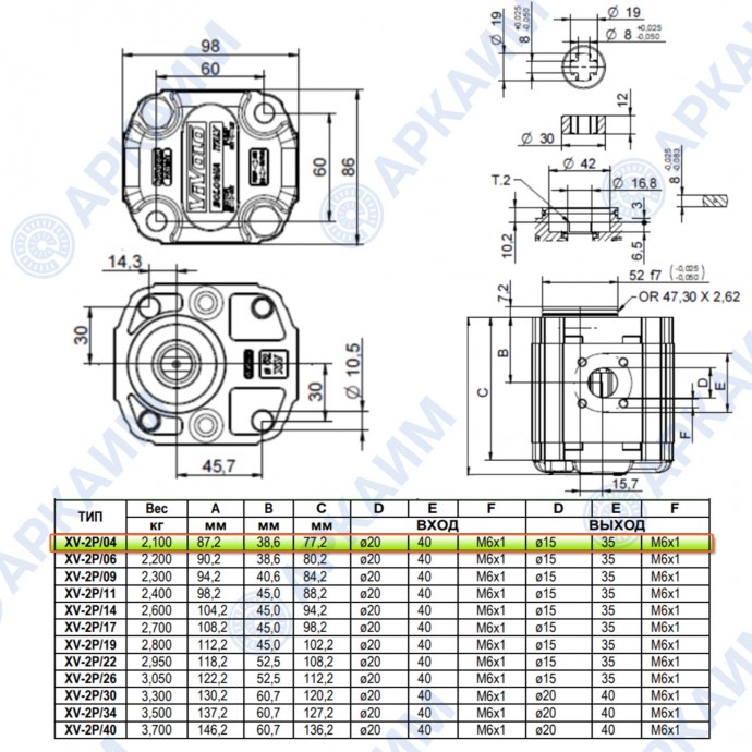 Гидронасос Vivoil X2P4132CSRA (XV-2P/0.4) 2 гр, 4.2 см3, до 14 л/мин, Ø15, M6, правое вращение