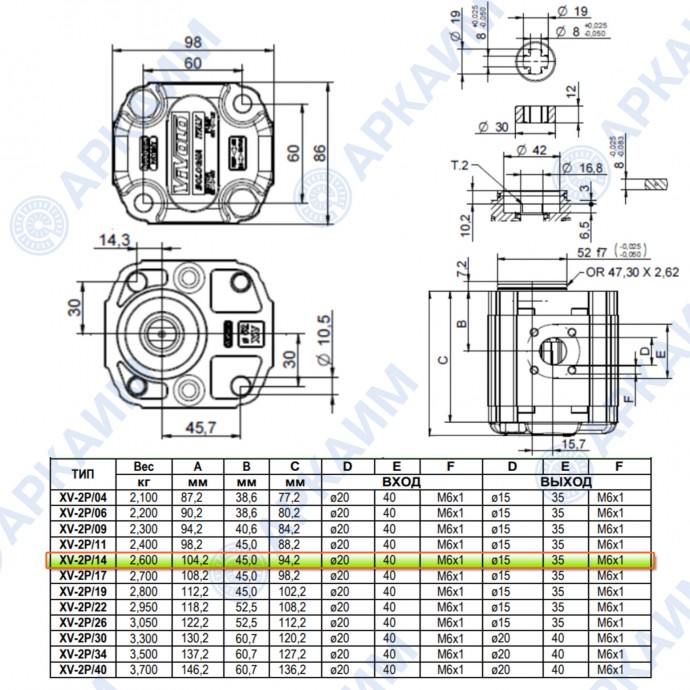 Гидронасос Vivoil X2P4931CSRA (XV-2P/14) 2 гр, 14.40 см3, до 49 л/мин, Ø15, M6, левое вращение