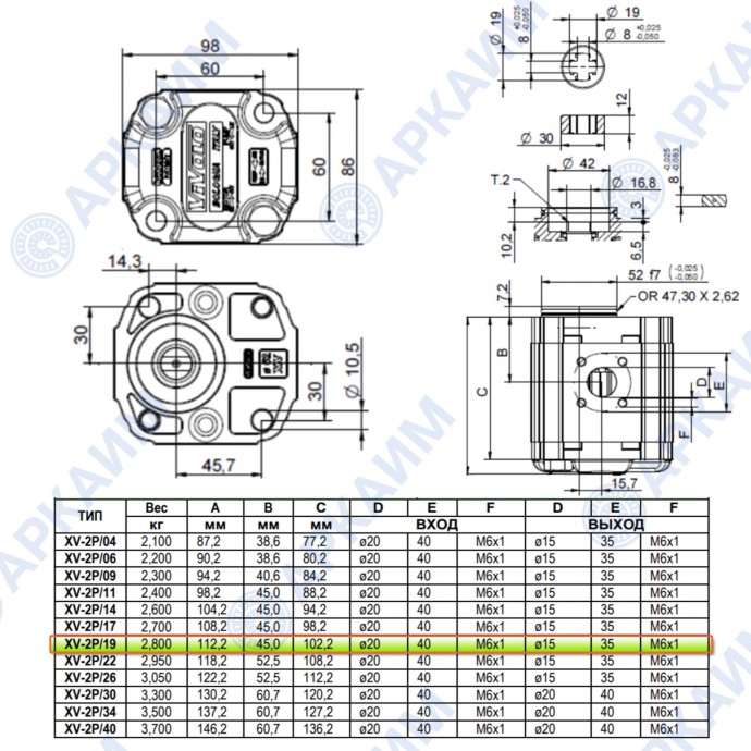 Гидронасос Vivoil X2P5331CSRA (XV-2P/19) 2 гр, 19.20 см3, до 57 л/мин, Ø15, M6, левое вращение