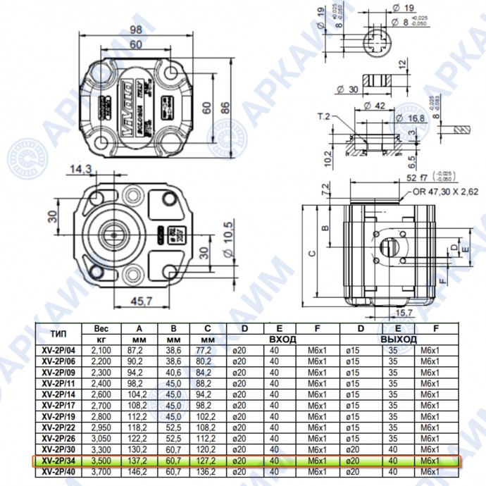 Гидронасос Vivoil X2P6131CSSA (XV-2P/34) 2 гр, 34.20 см3, до 85 л/мин, Ø15, M6, левое вращение