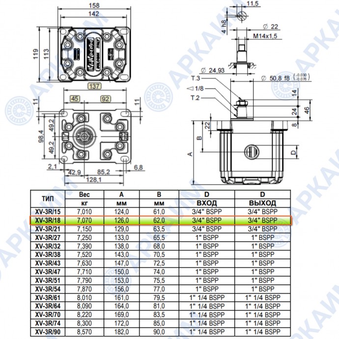 Гидронасос Vivoil X3P6801ADDA (XV-3P/18) 3 гр, 17.37 см3, до 49.52 л/мин, 3/4" BSPP, M8, левое вращение