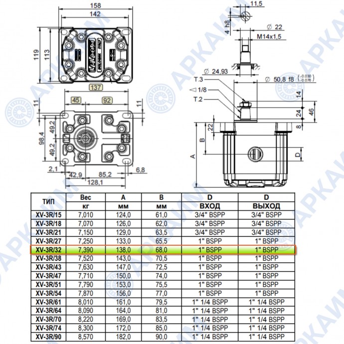 Гидронасос Vivoil X3P7401AEEA (XV-3P/32) 3 гр, 32.27 см3, до 91.96 л/мин, 1" BSPP, левое вращение