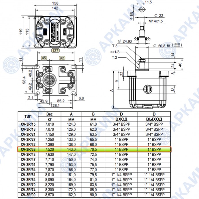 Гидронасос Vivoil X3P7801AEEA (XV-3P/38) 3 гр, 38.47 см3, до 91.37 л/мин, 1" BSPP, левое вращение