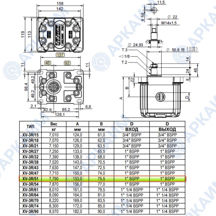 Гидронасос Vivoil X3P8101AEEA (XV-3P/51) 3 гр, 50.88 см3, до 111.17 л/мин, 1" BSPP, левое вращение