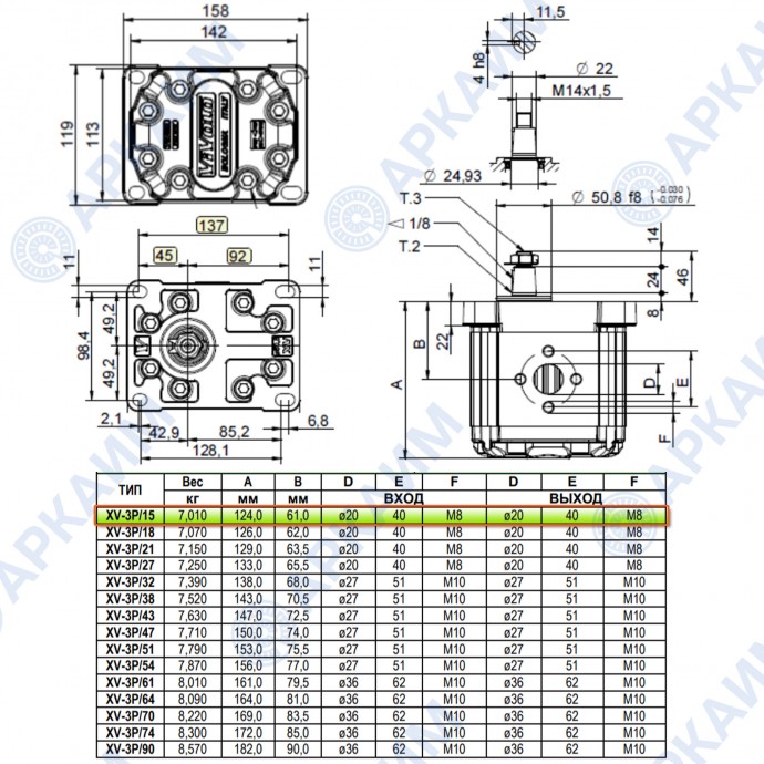 Гидронасос Vivoil X3P6601AAAA (XV-3P/15) 3 гр, 14.89 см3, до 42.44 л/мин, Ø20, M8, левое вращение