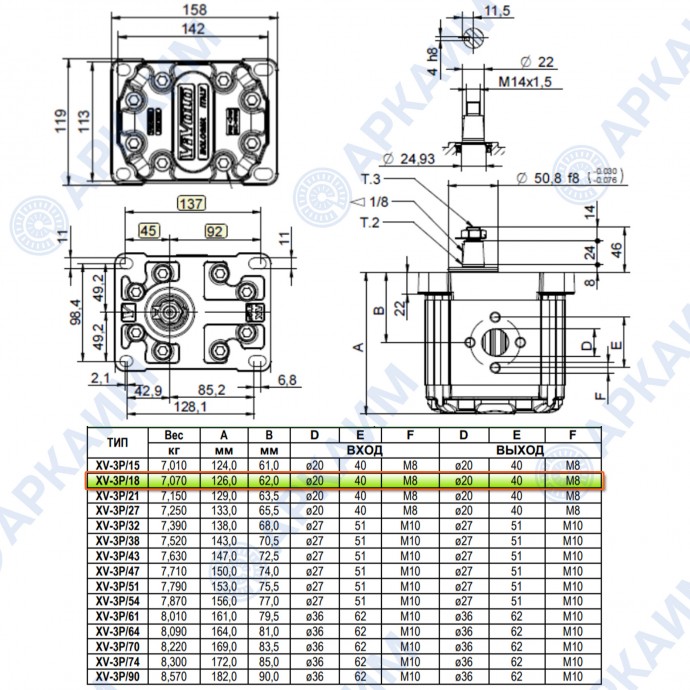 Гидронасос Vivoil X3P6801AAAA (XV-3P/18) 3 гр, 17.37 см3, до 49.52 л/мин, Ø20, M8, левое вращение
