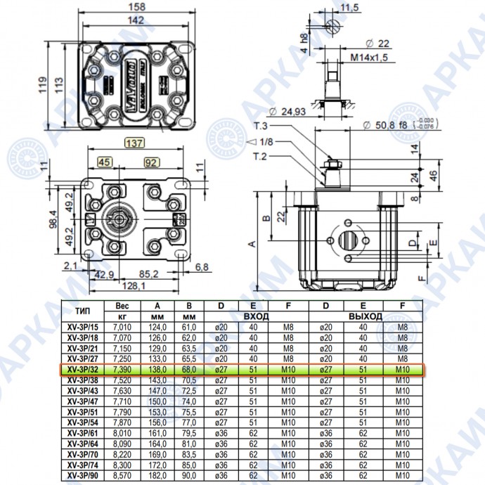 Гидронасос Vivoil X3P7401ABBA (XV-3P/32) 3 гр, 32.27 см3, до 91.96 л/мин, Ø20, M10, левое вращение