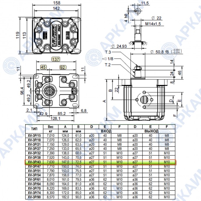 Гидронасос Vivoil X3P7801ABBA (XV-3P/38) 3 гр, 38.47 см3, до 91.37 л/мин, Ø20, M10, левое вращение
