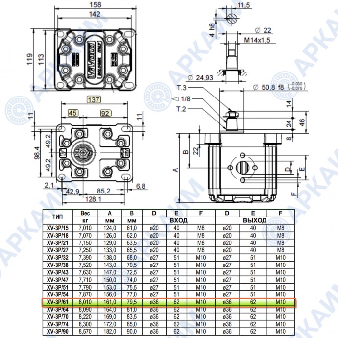 Гидронасос Vivoil X3P8301ACCA (XV-3P/61) 3 гр, 60.81 см3, до 132.87 л/мин, Ø36, M10, левое вращение