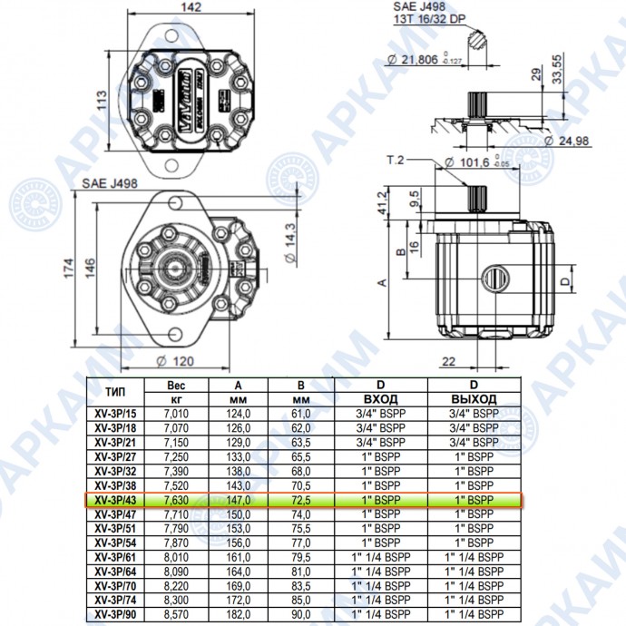 Стандартная поставка включает шлицевой вал Ø21,81, z=13, H=33,55, но этот насос имеет и другие модификации с цилиндрическим и коническим валами (подробнее в технической спецификации).