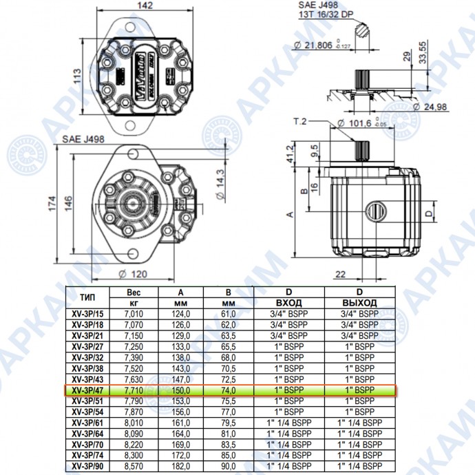 Гидронасос Vivoil X3P8001IEEA (XV-3P/47) 3 гр, 47.16 см3, до 112 л/мин, 1" BSPP, левое вращение