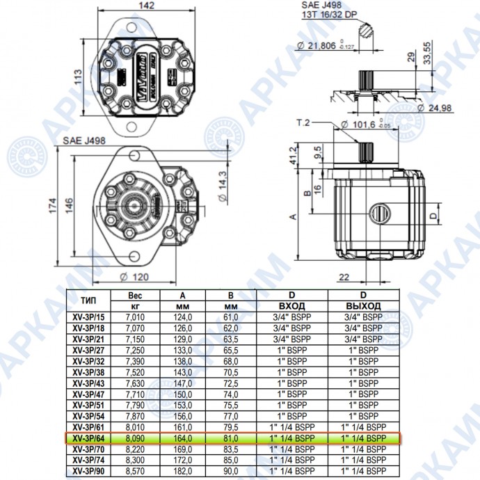 Гидронасос Vivoil X3P8501IFFA (XV-3P/64) 3 гр, 64.53 см3, до 141 л/мин, 1 1/4 " BSPP, левое вращение
