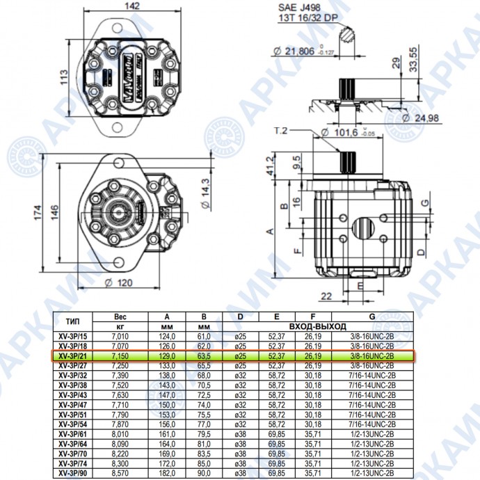 Гидронасос Vivoil X3P7002INNA (XV-3P/21) 3 гр, 21.10 см3, до 60.13 л/мин, ø25, правое вращение