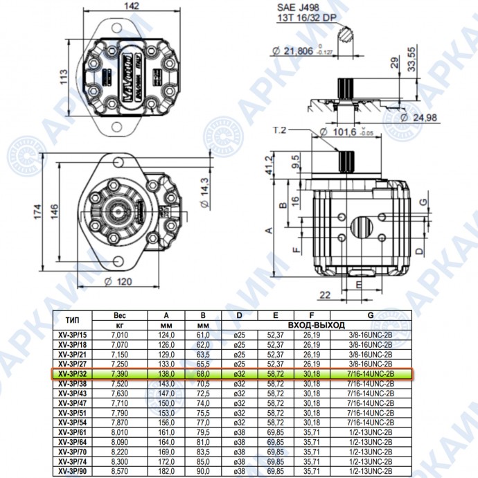 Гидронасос Vivoil X3P7401IOOA (XV-3P/32) 3 гр, 32.27 см3, до 91.96 л/мин, ø32, левое вращение