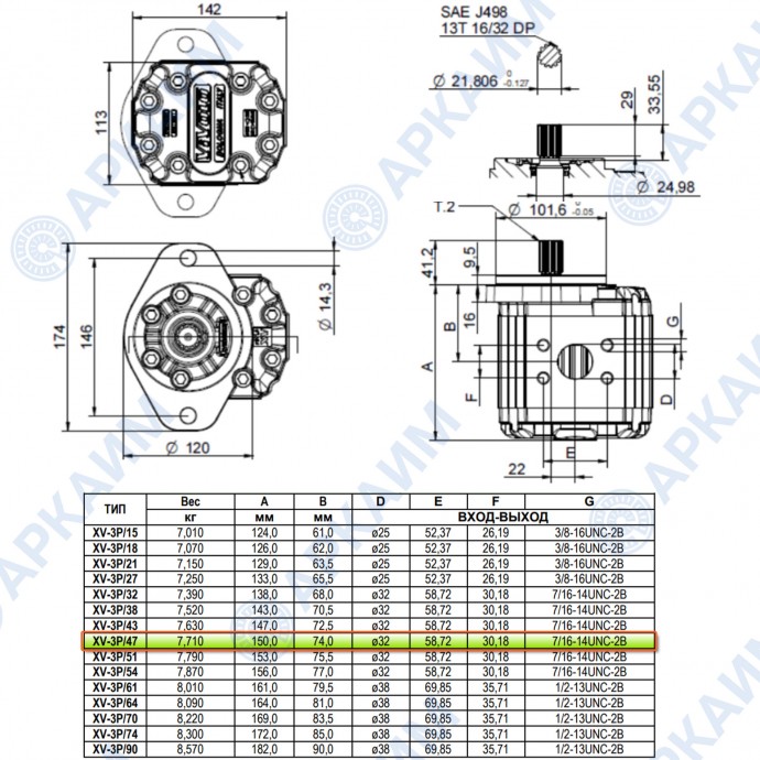 Гидронасос Vivoil X3P8001IOOA (XV-3P/47) 3 гр, 47.16 см3, до 112 л/мин, ø32, левое вращение