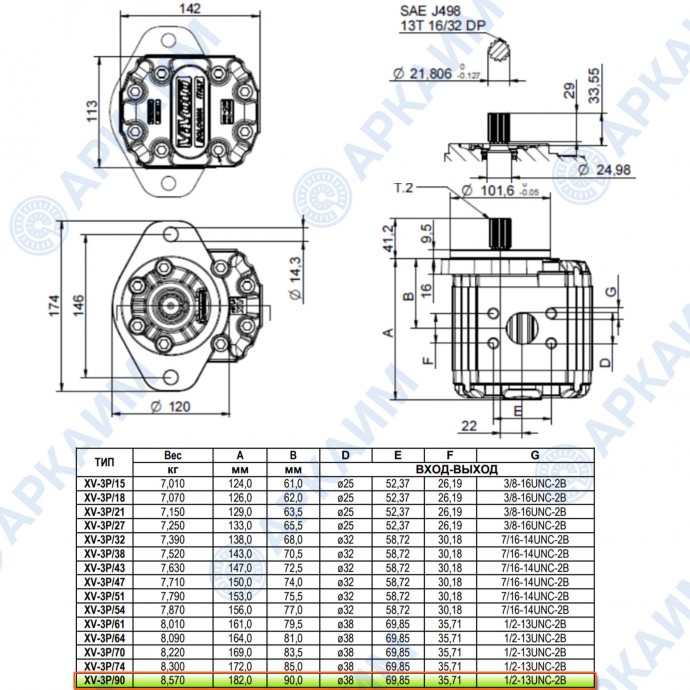 Гидронасос Vivoil X3P8901IPPA (XV-3P/74) 3 гр, 86.87 см3, до 189.81 л/мин, ø38, левое вращение