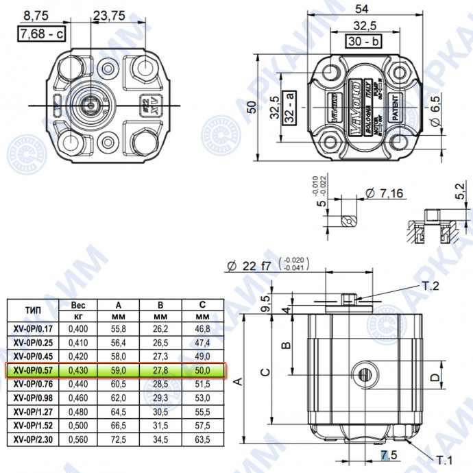 Гидронасос Vivoil X0P0522BBBA (XV 0P/0.57) 0 гр, 0,56 см3, до 4,8 л/мин, ¼ bsp, правое вращение