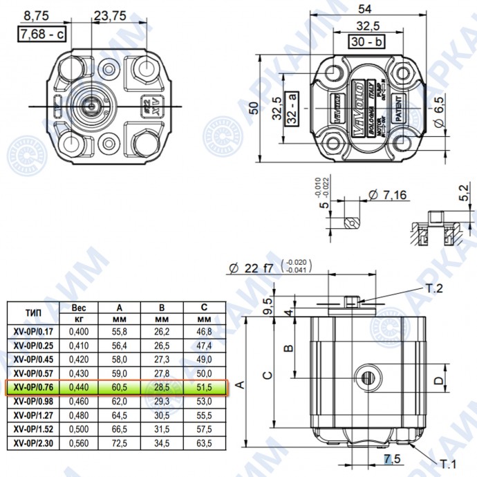 Гидравлический насос Vivoil X0P0621BBBA (XV 0P/0.76) преобразует механическую энергию привода в гидравлическую энергию потока рабочей жидкости для создания на выходе требуемого давления. Технически, перемещение жидкости происходит благодаря работе двух сопряженных шестерен, выдавливающих масло из полости нагнетания, в выходное отверстие, что определяет тип насоса – шестеренный однонаправленный.