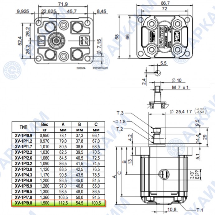 Гидронасос Vivoil X1P3601FBBA (XV-1P/9,8) 1 гр, 9,88 см3, до 39,2 л/мин, 3/8" BSPP, левое вращение