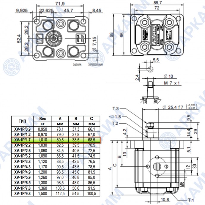 Гидронасос Vivoil X1P1801FIIA (XV-1P/1.7) 1 гр, 1.56 см3, до 10.2 л/мин, Ø12 M6, левое вращение