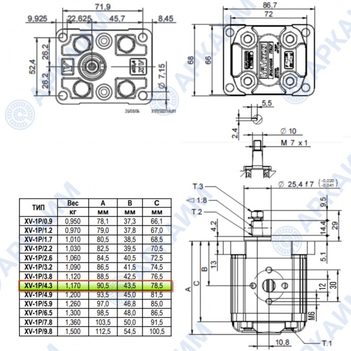Гидронасос Vivoil X1P2702FIIA (XV-1P/4,3) 1 гр, 4,16 см3, до 25,8 л/мин, Ø12 M6, правое вращение