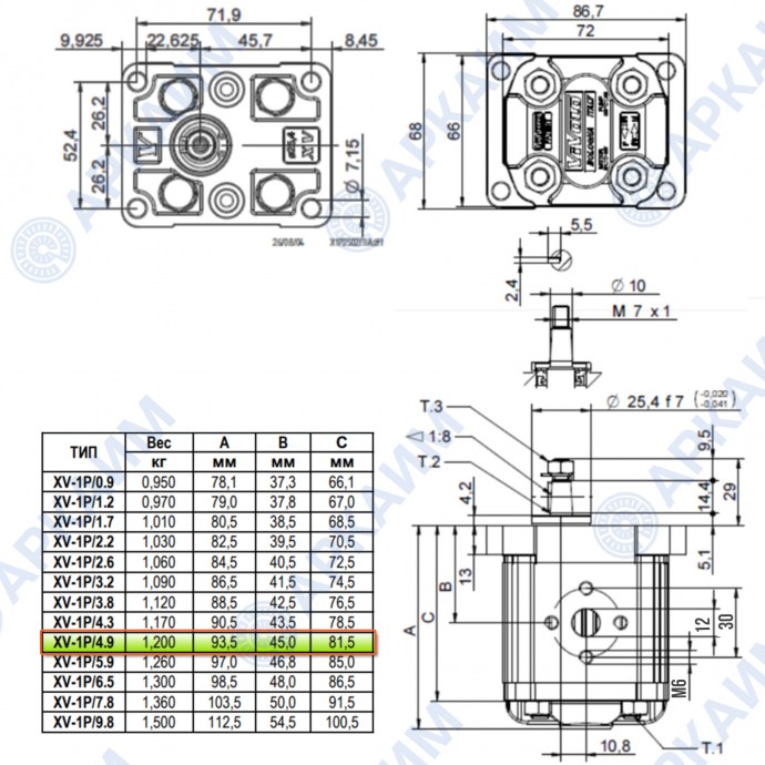 Гидронасос Vivoil X1P2902FIIA (XV-1P/4,9) 1 гр, 4,94 см3, до 29,4 л/мин, Ø12 M6, правое вращение