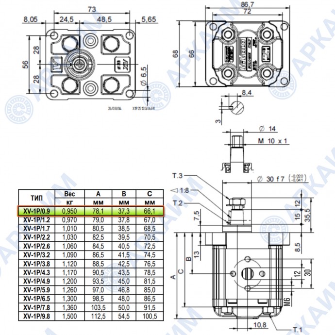 Гидронасос Vivoil X1P1611GIIA (XV-1P/0.9) 1 гр, 0.91 см3, до 5.4 л/мин, Ø14 M6, левое вращение