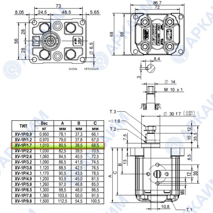 Гидронасос Vivoil X1P1812GIIA (XV-1P/1.7) 1 гр, 1.56 см3, до 10.2 л/мин, Ø14 M6, правое вращение