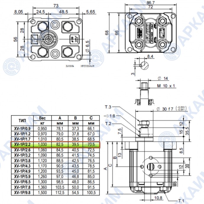Гидронасос Vivoil X1P2011GIIA (XV-1P/2,2) 1 гр, 2,08 см3, до 13.2 л/мин, Ø14 M6, левое вращение
