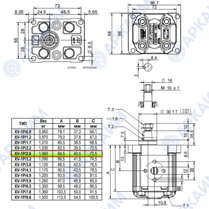 Гидронасос Vivoil X1P2111GIIA (XV-1P/2,6) 1 гр, 2,6 см3, до 15,6 л/мин, Ø14 M6, левое вращение