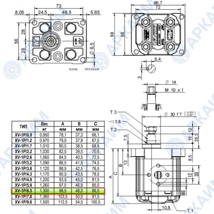 Гидронасос Vivoil X1P3212GIIA (XV-1P/6,5) 1 гр, 6,50 см3, до 32,5 л/мин, Ø14 M6, правое вращение