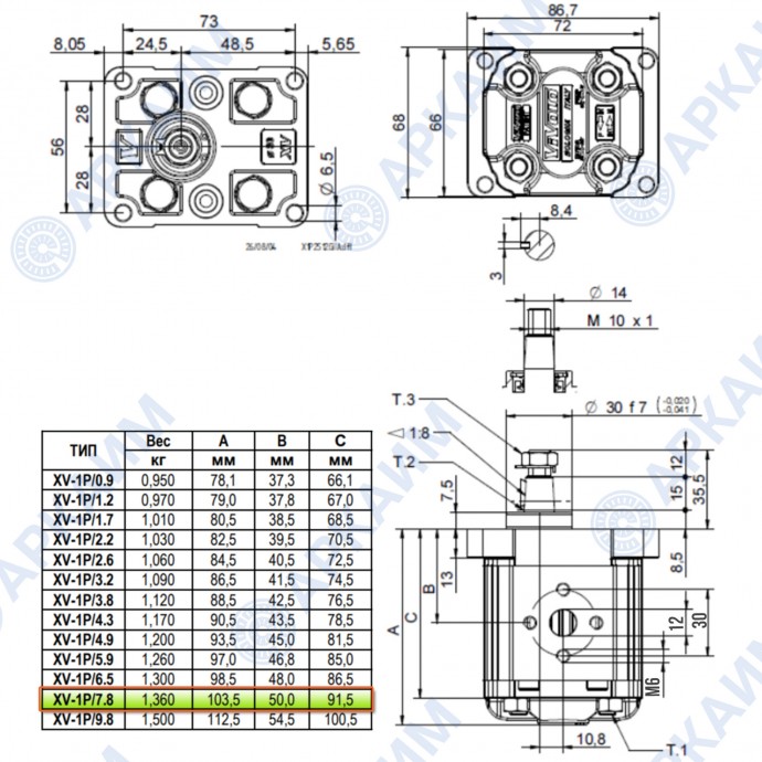 Гидронасос Vivoil X1P3412GIIA (XV-1P/7,8) 1 гр, 7,54 см3, до 39 л/мин, Ø14 M6, правое вращение